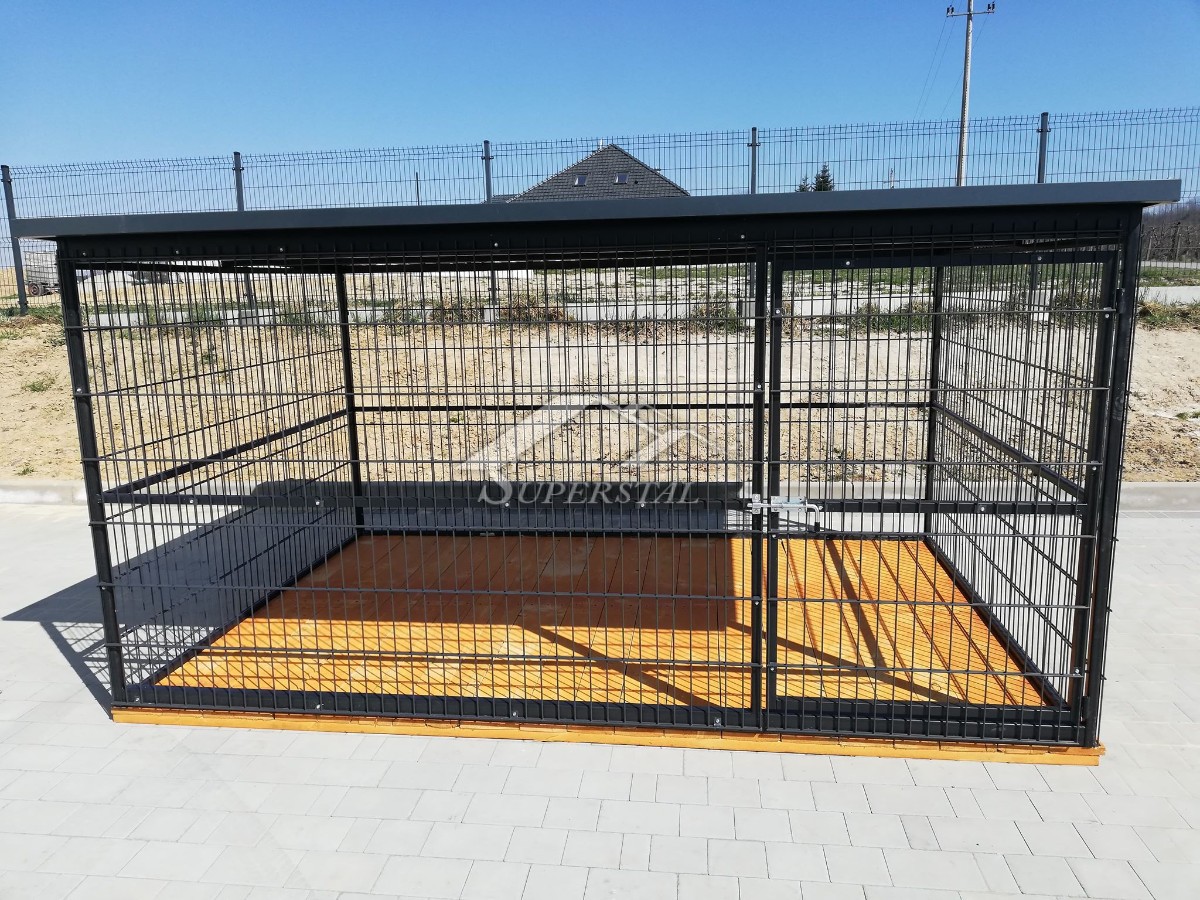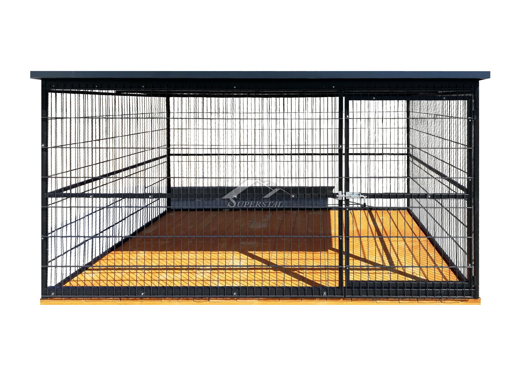 No paneļu sieta izgatavots voljērs ir no nemetināta paneļu sieta, pārklāts ar grafīta krāsu RAL 7016. Režģa elementi ir izvietoti horizontāli. Atstarpes starp ģipša stieņiem (maks. 10 cm. ). Voljēram ir horizontāls pastiprinājums no melni krāsota stūra. Daži metinātie elementi noklāti ar gruntskrāsu. Lielākiem voljēriem var mainīties struktūra, lai saglabātu voljera stabilitāti un izturību. Voljēra izmērs 3x2m. ar ieejas durvīm. Katrs voljērs tiek izgatavots pēc pasūtījuma.