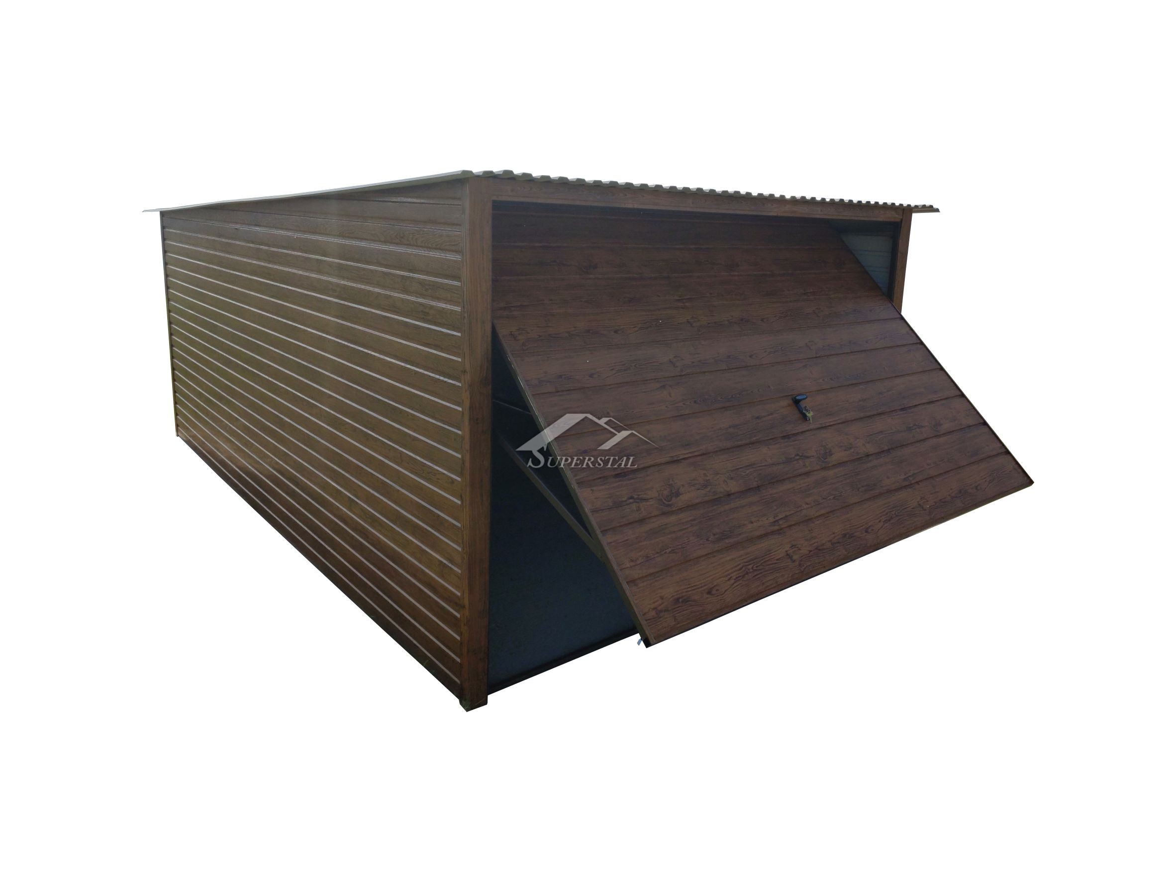 Jumts - pārklāts ar T-14 akrila trapecveida loksni pirmajā klasē BRŪNĀ krāsā (cenā iekļauta iespēja mainīt jumta loksnes krāsu).